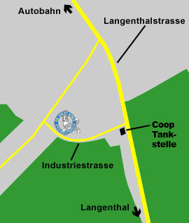 Zufahrt: Die Zu- und Abfahrt hat über die Industriestrasse zu erfolgen, benutze ausschliesslich die Ein- und Ausfahrt bei der Coop Tankstelle.